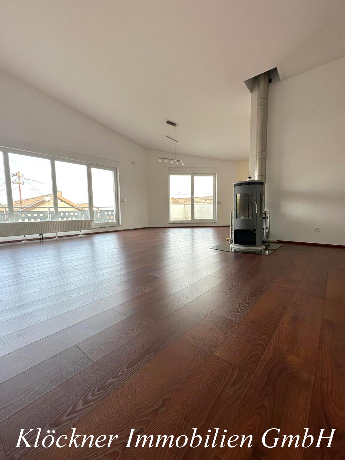 Im Mittelpunkt steht der weitläufige Wohn- und Essbereich mit offener Küche, der durch seine große Fensterfronten begeistert. Ein stilvoll integrierter Kamin sorgt für eine behagliche Atmosphäre und macht diesen Bereich zum zentralen Lebensmittelpunkt der Wohnung. Von hier aus sowie von allen weiteren Räumen besteht direkter Zugang zur umlaufenden Terrasse. Hier kann man die Sonne den ganzen Tag genießen und den Blick über Riegelsberg schweifen lassen.
